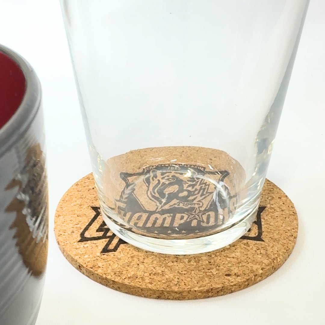 コルクコースターに優勝ロゴをレーザー刻印することで、